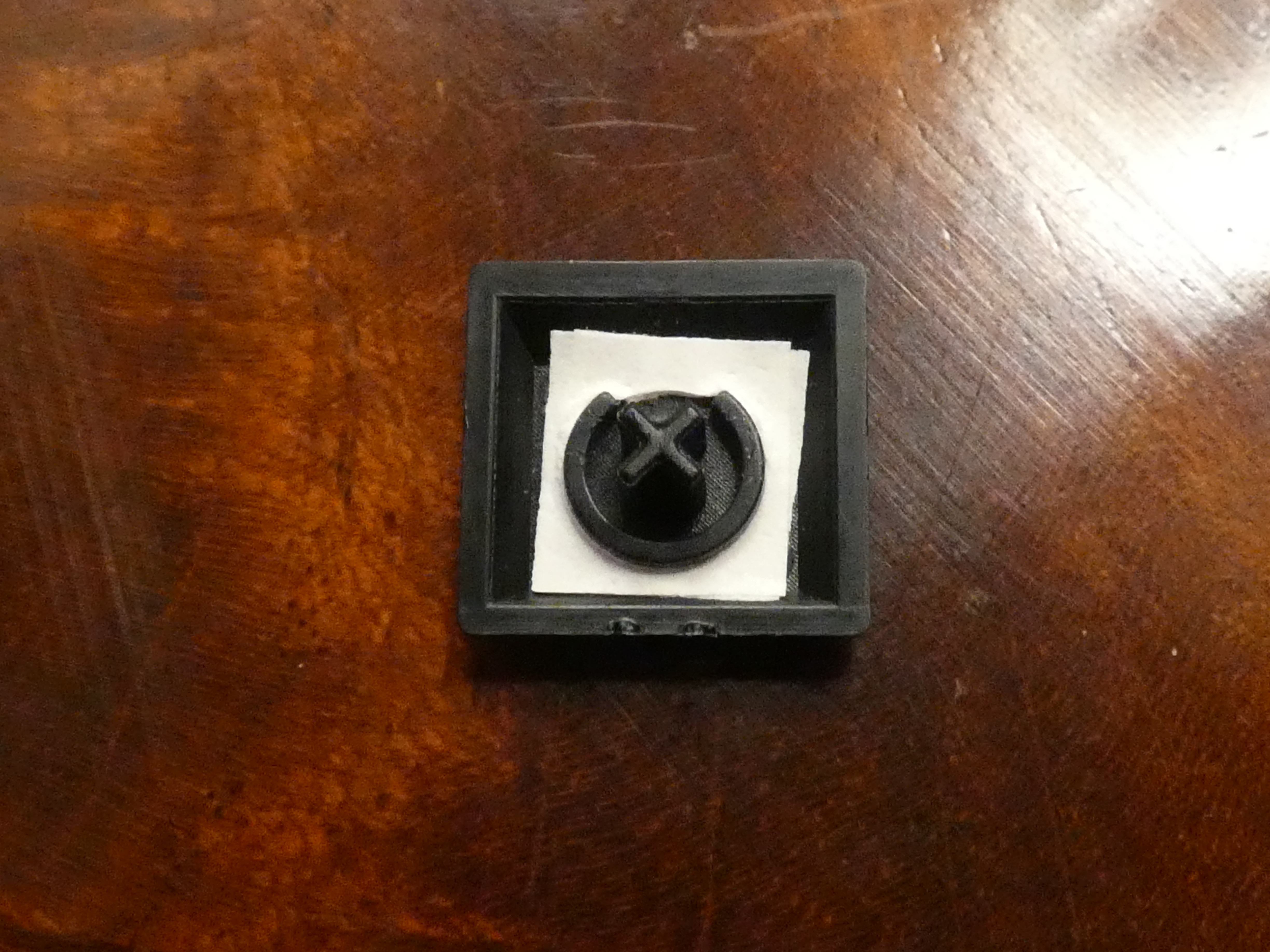 Multiple people have written about how they did this, for example Avery in this blog post including a 3D-printable model for the rings. I simply used paper with two common utensils: A pair of scissors and a hole puncher. I had hoped that the hole puncher’s punched holes have the perfect size to fit around the ring on the keycap. As it turned out they were just a tiny bit too small, but I was still able to squeeze them on with a bit of fiddling around, and the tightness makes sure that the paper doesn’t fall off, so I guess it’s a good thing and it turned out to be the perfect size after all. So I took a stack of paper, punched a couple of holes in them and cut out a surrounding square with the scissors. One layer of these below the keycaps was still very unreliable, so I added a second layer. Some keys now appeared to activate perfectly while others still sometimes didn’t register. I tried putting on a third layer, but the ring at the bottom of the keycap was already almost fully covered and I was unable to get another layer on, so I left it like this. A third layer also made the keys feel even more different. My top row is definitely not perfect and I frequently mistype my password due to it, but fortunately the backspace key is one of the ones that works perfectly, so it’s been working well enough. I hope all keys will work reliably once I try the other method.